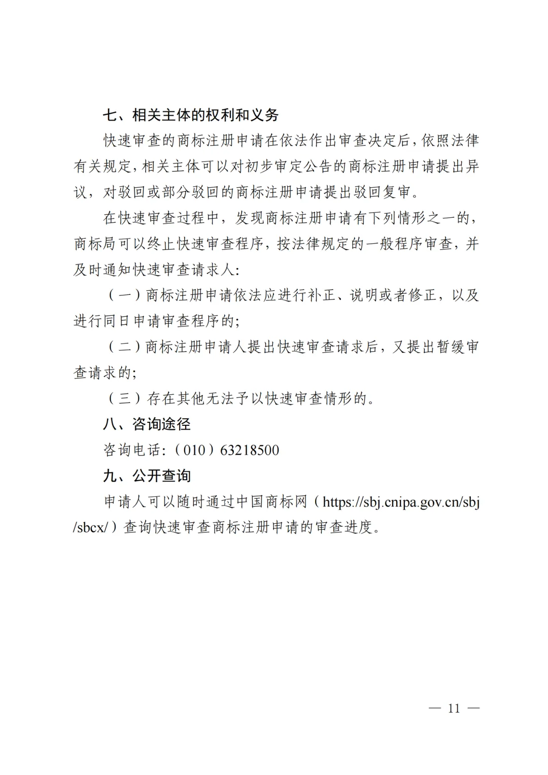 第十一条 本办法自发布之日起施行。其他有关商标注册申请快速审查的规定,凡与本办法相抵触的以本办法为准。原《商标注册申请快速审查办法(试行)》(国家知识产权局第四六七号公告)同时废止。
